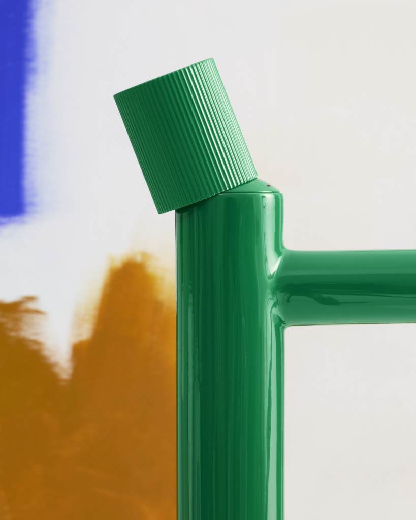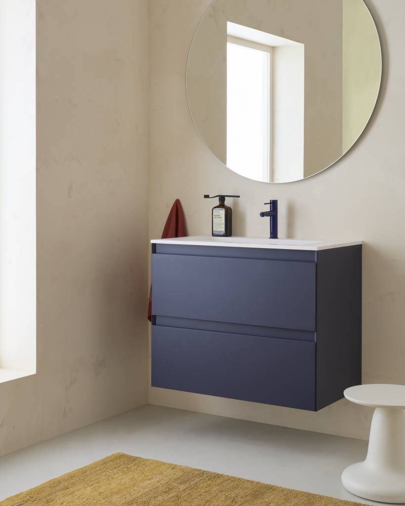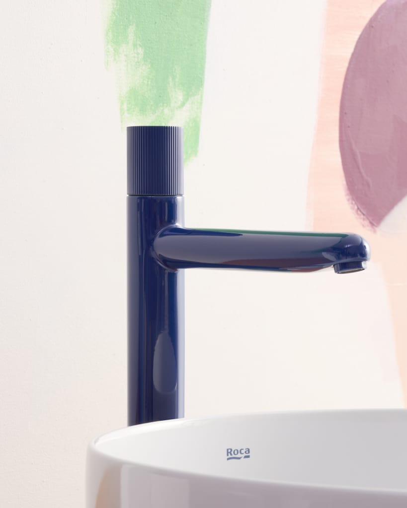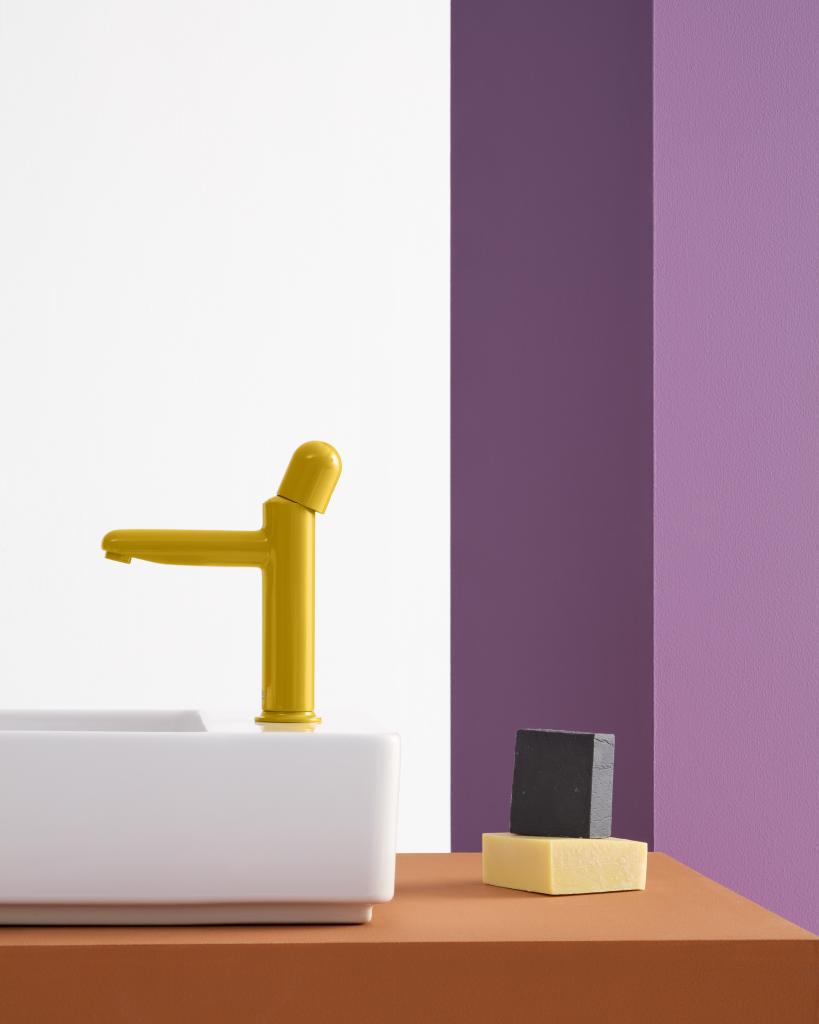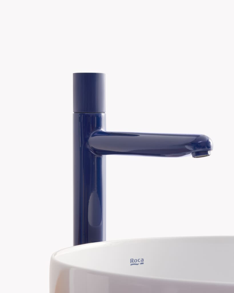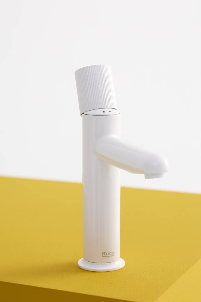 Basin mixer with smooth body, 2 holes, deck-mounted handle and flexible supply hoses. Waste not included. Stripes handle. L-Size.
