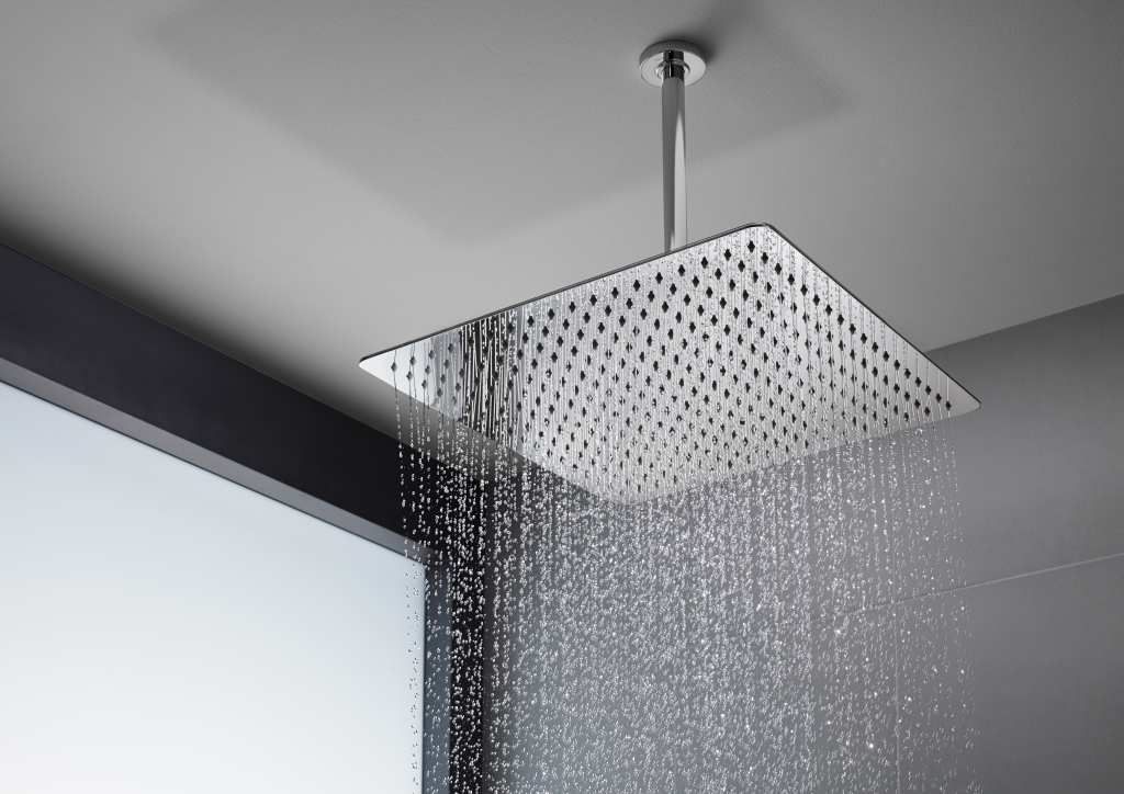 Round adjustable stainless steel shower head for wall or ceiling installation in chrome. Rain function. Wall/ceiling support kit/arm not included.