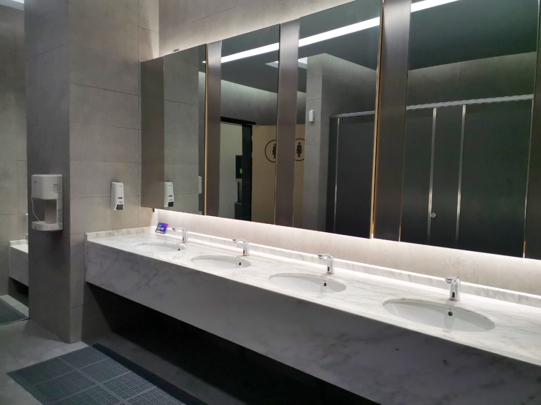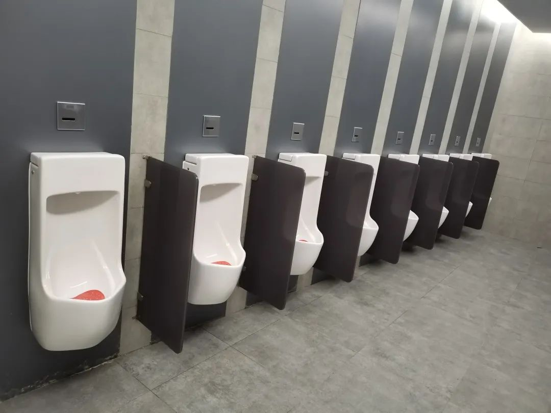 男卫生间使用了Roca的赛特挂墙式小便器与启克挂墙式小便器,搭配盛克R入墙式小便感应器,以零触解决方案防止病毒和细菌传播,联合为使用者创造舒适贴心的使用体验。